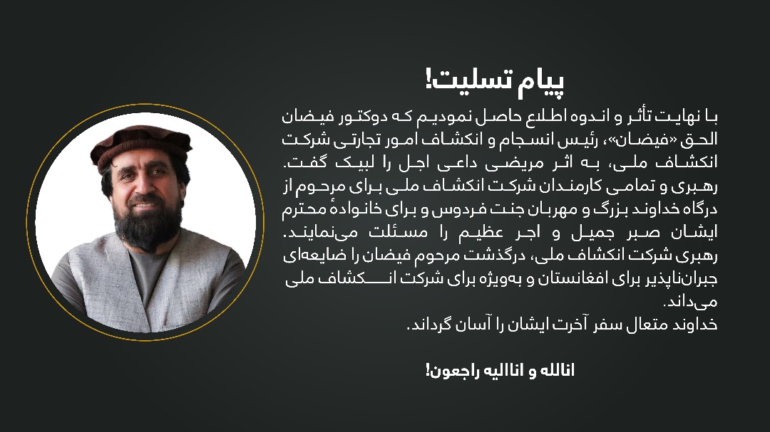 با نهایت تأثر و اندوه اطلاع حاصل نمودیم که دوکتور فیضانالحق «فیضان»، رئیس انسجام و انکشاف امور تجارتی شرکت انکشاف ملی، به اثر مریضی داعی اجل را لبیک گفت.