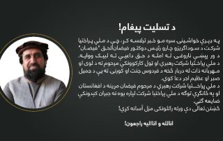 په ډېرې خواشینۍ سره مو خبر ترلاسه کړ، چې د ملي پراختيا شرکت د سوداګريزو چارو رئیس دوکتور فیضانالحق "فیضان" د ور پېښې ناروغۍ له امله د حق داعیې ته لبیک ووایه. د ملي پراختيا شرکت رهبري او ټول کارکوونکي مرحوم ته د لوی او مهربانه ذات له دربار څخه د فردوس جنت او کورنۍ ته یې د جمیل صبر او عظیم اجر دعا کوي. د ملي پراختيا شرکت رهبري د مرحوم فيضان مړينه د افغانستان او په ځانګړې توګه د ملي پراختيا شرکت لپاره یوه نه جبران کېدونکې ضایعه ګڼي. څښتن تعالی دې ورته راتلونکی مزل آسانه کړي! انا لله وانا الیه راجعون!